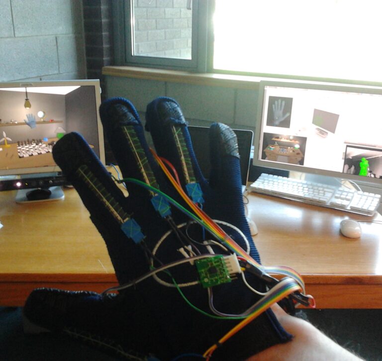 A simulated hand and environment is rendered in Unity, which reacts to the input from the user, and sends back feedback to the glove.